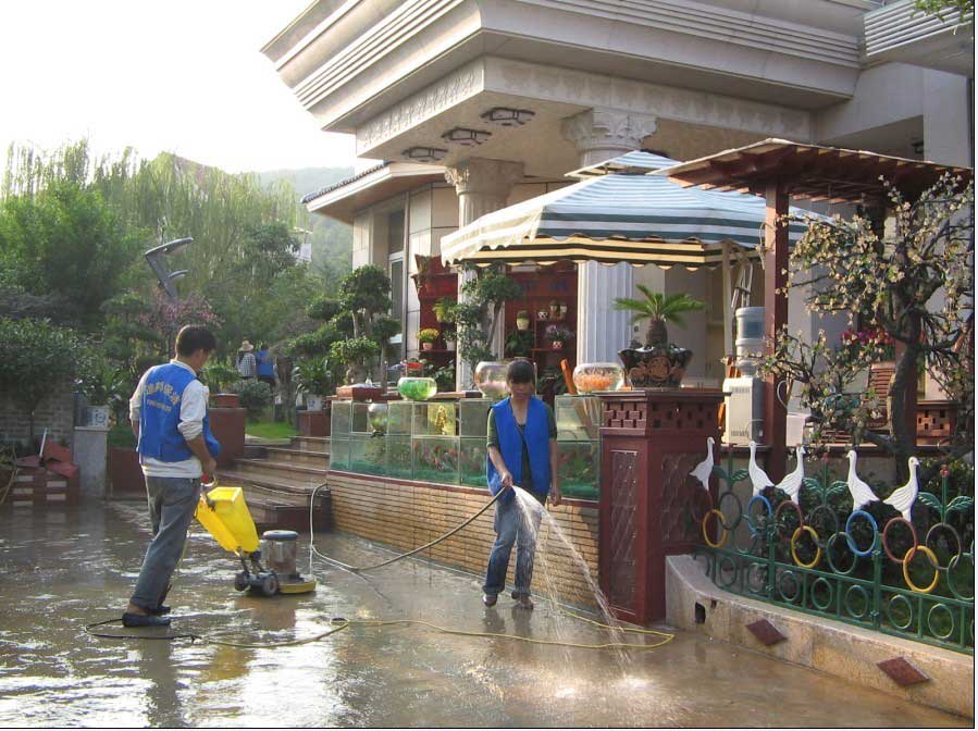 迪邦公司保潔員正在為“渝水區(qū)法院”做地面石材翻新
